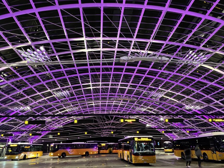 Unsere Mädchen haben gestaunt über das in violett getauchte, wunderbar erleuchtete Postautodeck in Chur.